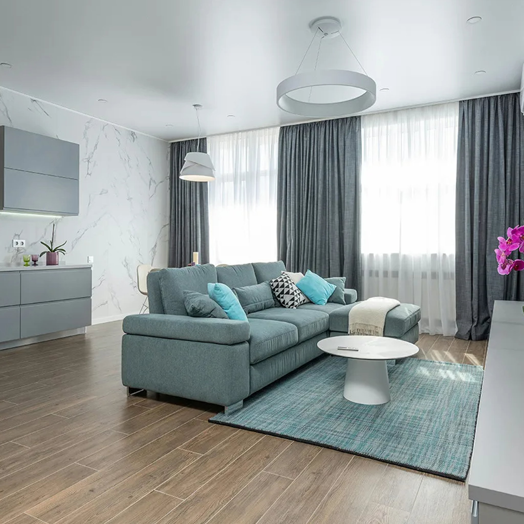 Laminate floors are as easy to care for as they are to install. Vacuum or dust-mop regularly to remove grit, use felt pads or glides on furniture legs, and place mats at exterior doors to keep dirt out. With simple upkeep, your floors stay beautiful for years.